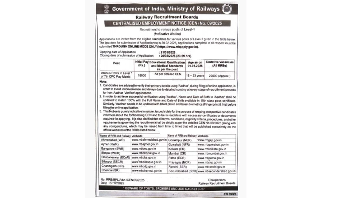 | Minimum Age:18 Year Maximum Age:33 Year RRB Provides Age Relaxaton For The Official Notification As Per Their Regulation. | 22000 (Tentative Post) |